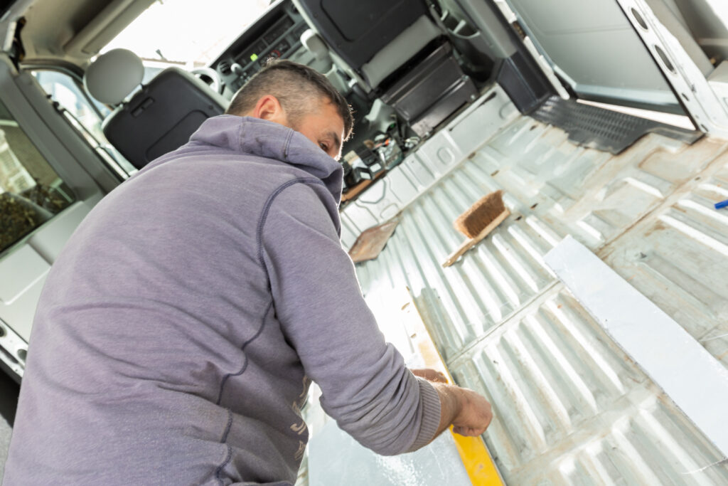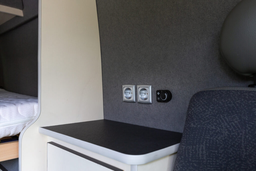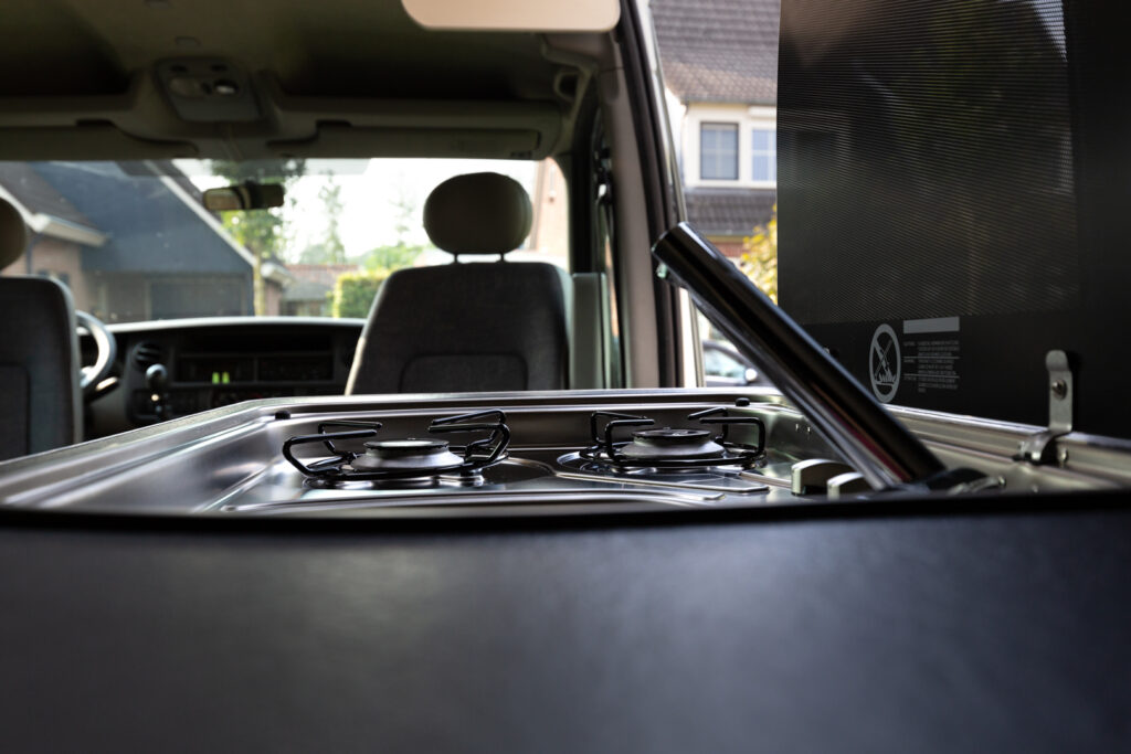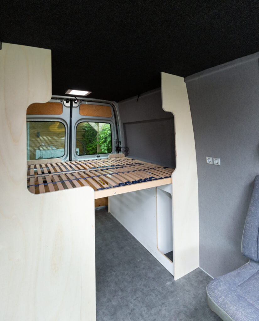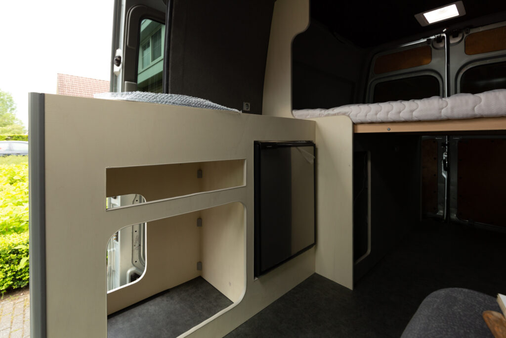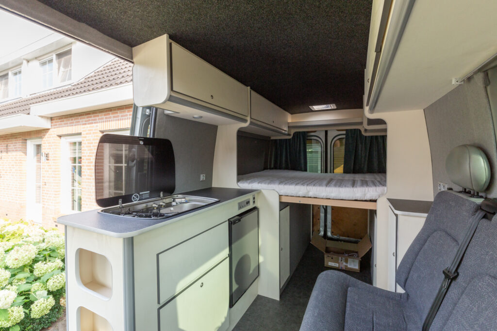 Deze Nissan Interstar heeft ook een prachtige transformatie ondergaan. Na de aanschaf moest eerst (bijna) alles uit het interieur gehaald worden (deze had een dubbele cabine). En dan begint het leuke werk 🙂 Luifel monteren, gat voor dakluik zagen, zonnepaneel bevestigen, isoleren, wanden en vloer bekleden, elektra aanleggen, panelen zagen, lakken, afwerken en natuurlijk alle apparatuur inbouwen. Mooie klepkasten en verduisterende gordijnen maken de bus af. Deze camperbus heeft ook een stand-kachel gekregen zodat kamperen het hele jaar door aangenaam kan zijn.