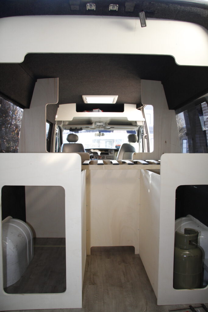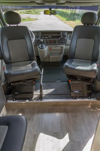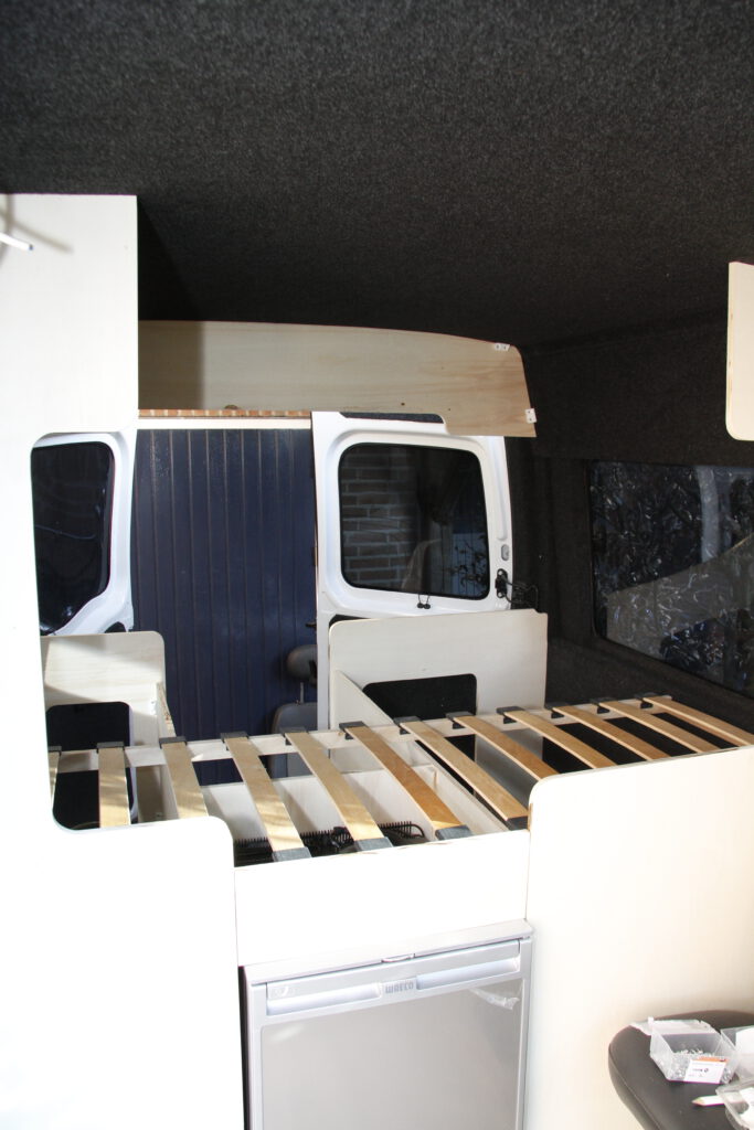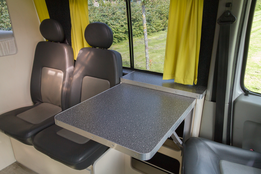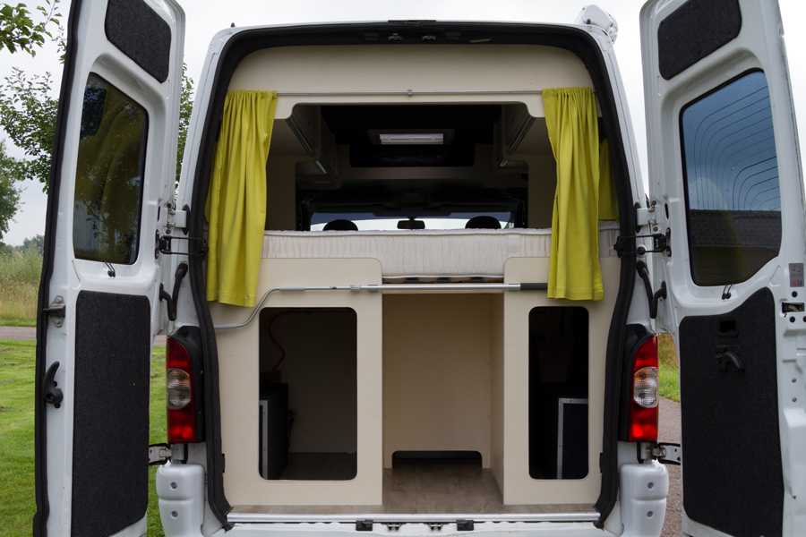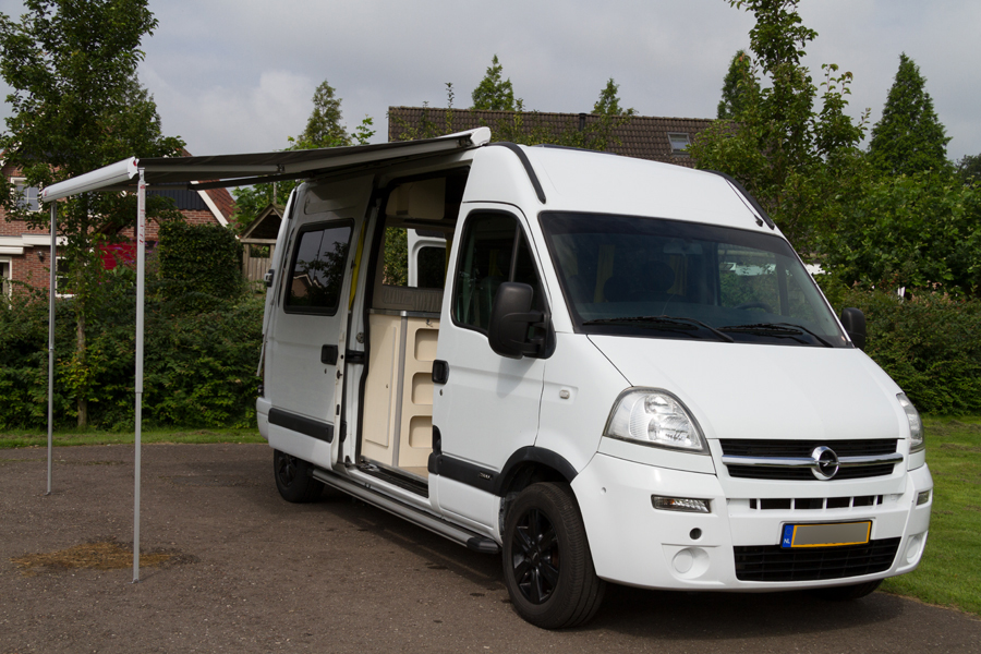 een witte Opel Movano van het bouwjaar 2007 hebben we omgebouwd tot praktische camper met veel binnenruimte en opbergkasten. Een vast 2-persoonsbed met grote bergruimte eronder. Vanwege het wat oudere bouwjaar konden we deze bus met extra stoelen toch 4 persoons op naam zetten. Handig voor de kampeerders die met een tent zo toch mee kunnen reizen. Of wanneer je gewoon met je gezin op familiebezoek wilt gaan. Uiteraard is de bus eerst goed geïsoleerd. Er is een dakluik ingemaakt en de voorstoelen zijn draaibaar gemaakt. De bus is o.a. voorzien van een luifel, inklapbare tafel, koelkast en kook/spoelblok.